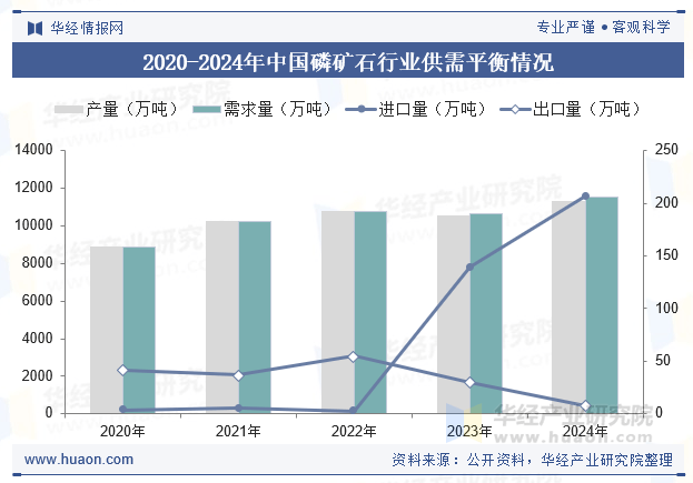我国磷矿分布不均匀,主要分布在云、贵、川、鄂4个省份与其他产磷国相比,我国磷矿品位较低,平均入选品位(ω(P2O5))为19.4%,ω(P2O5)30%以上的高品位富矿储量占比不足10%。近十多年来,我国每年的磷矿开采量基本都在1亿吨左右,消费量和开采量基本匹配。但是近2年,在下游的推动下,我国磷矿产业呈现出供应紧张的态势,最突出的表现为进口量激增,2024年我国磷矿进口量增长至207万吨,产量为11353万吨,需求量为11552万吨。