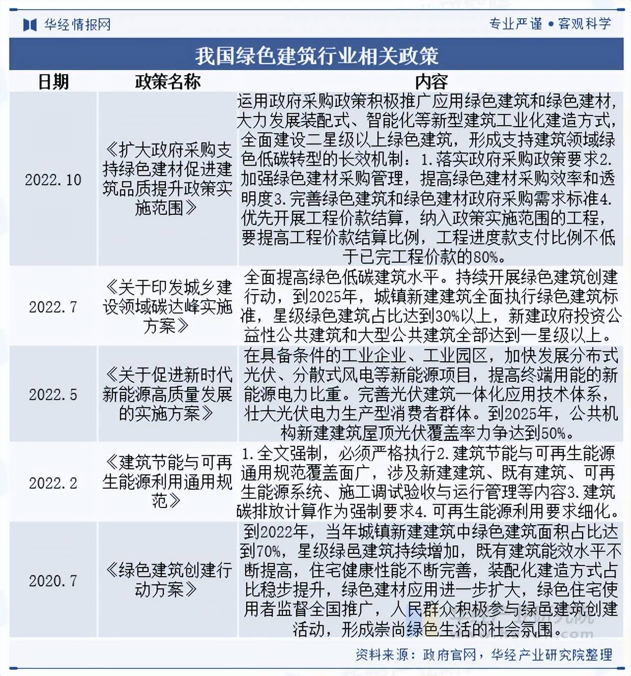 在建筑行业内推广绿色建筑由来已久,十四五期间,在双碳目标的催化下,绿色建筑大面积铺开已是大势所趋。2022年5月,发改委和能源局联合发布《关于促进新时代新能源高质量发展的实施方案》,到2025年,公共机构新建建筑屋顶光伏覆盖率力争达到50%。2022年7月,发改委和住建部联合发布《关于印发城乡建设领域碳达峰实施方案》,到2025年,城镇新建建筑全面执行绿色建筑标准,星级绿色建筑占比达到30%以上