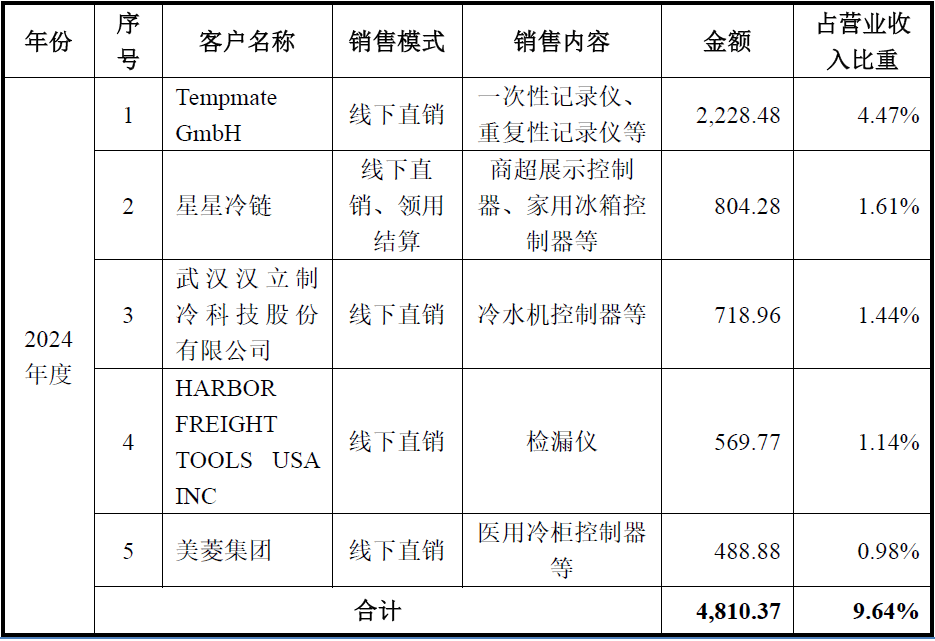 考虑到发行人的制冷设备主控板主要销售对象为各大制冷设备制造商,理论上发行人的前五大客户应该相对集中,相反上表显示发行人大客户极其分散,考虑到发行人以销售主控板为主的高收入基数,发行人客户的离散度之高可能超乎意料。