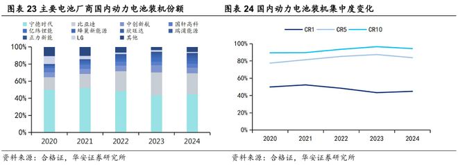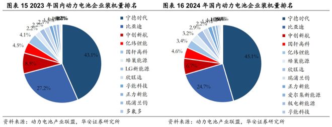 动力电池市场竞争格局较稳定,行业集聚程度高,梯队分化明显。据动力电池产业联盟数据,2024年中国动力和其他电池累计产量为1,096.8GWh,累计同比增长41.0%;动力电池累计装车量548.4GWh, 累计同比增长41.5%,其中宁德时代占比份额为45.1%,同比增加1.89pct。从装机量排名前十五的企业变动情况来看,与去年竞争格局基本一致,排名变化主要出现在二、三线厂商。新增厂商极电新能源、耀宁新能源背靠吉利汽车,因湃电池背靠广汽集团,均为老牌车企自造电池布局企业。相对缺少规模经济优势的二、三线厂商将进入产能整合和优胜劣汰的阶段,全球化布局尤其是海外建厂,实现本地化配套成为部分厂商的突围方向。