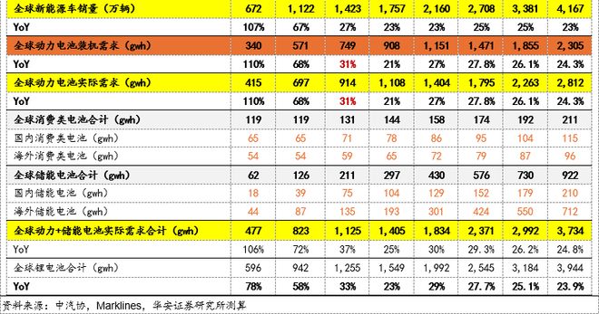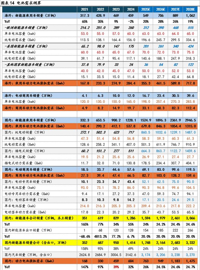 锂电需求结构分化,增长逐渐向“质变”过渡。过去几年内,我国新型电池行业在市场规模、技术创新、产业链协同以及国际化发展等方面均取得了显著成就,需求增长逐渐从“量增”转向“质变”。动力电池增速换挡但技术创新溢价有所提升,新能源汽车市场在经历了多年的高速增长后,逐渐进入相对稳定的发展阶段,新增需求增速趋于平稳,结构性机会渐显,电动重卡和工程机械、电动船舶等领域对新型电池需求旺盛。储能电池维持高增但利润率略承压,未来存在巨大的发展空间。消费电子市场规模相对较小,依赖具体场景创新打开增长天花板。我们认为2025年全球锂电池需求合计1992GWh,同比增长约29%,其中动力电池需求可达1404GWh,储能电池需求约430GWh,消费电池需求约158GWh。