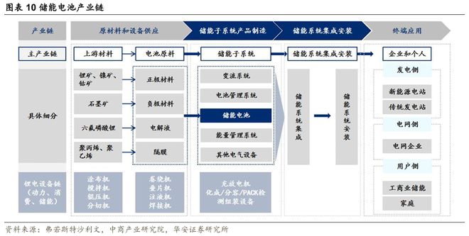 储能电池是储能子系统的构成部分,可以储存电能并在需要时输出电能以供使用,具备削峰填谷、系统调频、平滑新能源电力输出等功能,在与子系统其他产品集成安装后,其产业链下游广泛应用于发电、输配电、用电等电力系统环节。储能电池是将化学能转化为电能的装置,主要以锂离子电池、液流电池、铅蓄电池和钠基电池等储能技术为主。作为产业链价值量最高的部分,储能电池成本约占储能系统总成本的60%。