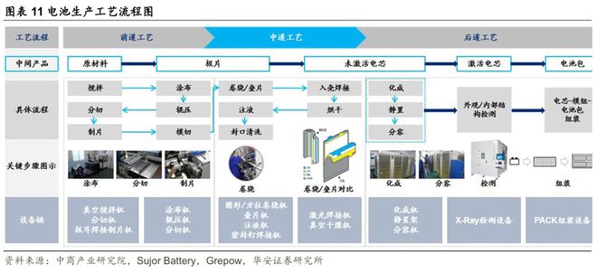 电池生产工艺流程复杂,技术掌控与极限制造为护城河关键一环。电池的生产工艺流程多、工艺控制难度大、且技术仍然在持续迭代。由产业链构成可见,工艺流程涉及四大电池原料以及各类锂电设备,主要可分为前、中、后三道工艺。电池原料包括正极材料、负极材料、电解液和隔膜。前道工艺投入正负极原材料,经过搅拌、涂布、辊压、分切等工序生产制造极片;中道工艺将极片进行卷绕或叠片,形成电芯的功能结构;后道工艺通过化成、分容,将电芯激活,并进行检测和分选,最终组装成电池包。规模化生产是企业降低成本及精进生产工艺的重要途径,制造能力、车企订单和产能投放情况均构成头部企业的护城河。