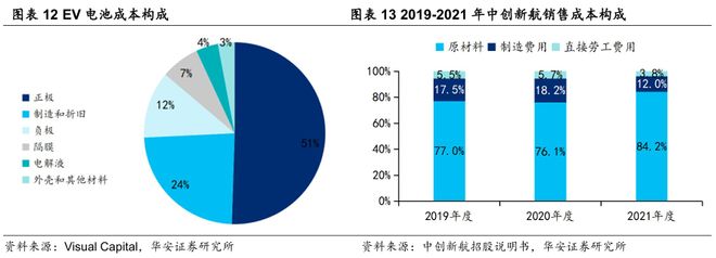 原材料成本占比高,技术进步和规模经济促降本。电池生产工艺流程中涉及的原材料费用、工艺和设备相关的直接劳工费用和制造费用,共同构成电池生产成本。中创新航招股说明书显示,原材料成本占总成本比重较高,其中2021年占比高达84%。根据Visual Capital对EV电池单元零部件的成本拆分,每个电池的正极成本约占电池总成本的51%,负极占电池成本的12%,制造和折旧成本占比为24%。正极材料是电池生产成本最高的部分,由于电池放电时,正极会储存从负极流入的电子和带正电的分子,直到电池再次充电,因而正极对电池性能具有决定性作用。合成电池正极的主要材料包括锂镍钴锰铝等金属元素及其聚合物或氧化物,正极材料价格与上游矿材价格密切相关。2021年原材料价格上涨推动电池成本上升,而生产技术进步和规模经济在一定程度上减轻了价格联动的影响,有效支撑盈利水平。