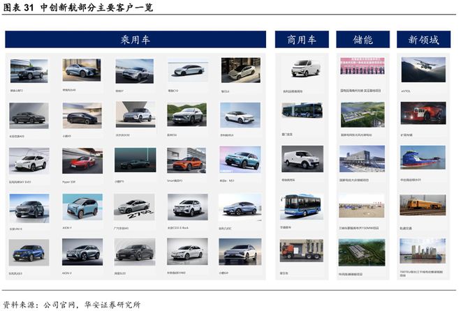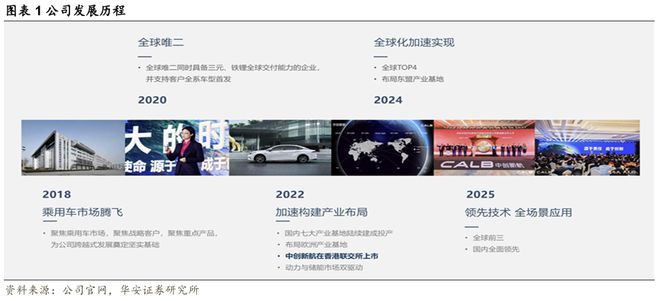 2015年12月,金沙投资、洛阳公司及华科投资在江苏常州创立中航锂电有限公司;2018年公司开启战略重组和转型,2019年7月重组完成后,公司最终由金坛方控制;2021年11月,公司正式更名为中创新航;2022年中创新航在港交所上市;2024年以来,中创新航加速推进全球化;2025年3月,中创新航正式纳入港股通标的名单。中创新航是专业从事锂电池、电池管理系统及相关集成产品和锂电池材料的研制、生产、销售和市场应用开发的新能源高科技企业。公司致力于构建全方位能源运营体系,为以动力及储能为代表的新能源全场景应用市场提供完善的产品解决方案和全生命周期管理。动力业务:在乘用车领域,公司以“高能量密度、高安全、长寿命、超快充、全气候”为核心产品竞争力,是全球少量同时具备三元、铁锂全球交付能力的企业,支持客户全系车型首发。在商用车领域,公司以“长寿命、高能量密度、高安全、全气候、标准化、可扩展性强”为核心产品竞争力,全面覆盖纯电动公交车、通勤车、物流车、工程机械等领域,搭载车型已广泛应用于高温高湿、偏远高原、高寒低压等多应用场景,交付配套量行业领先。2024年公司动力业务收入195.51亿元,占总营业收入比重约70%。储能业务:公司以“高安全、长寿命、高经济效率、高度集成率”为储能核心产品竞争力,为客户提供满足多种需求的储能集成系统服务,全面覆盖发电侧风光储、电网侧调峰调频、用户侧削峰填谷、备用电源及船用储能等应用领域。2024年公司储能业务收入82.01亿元,占总营业收入比重约30%。