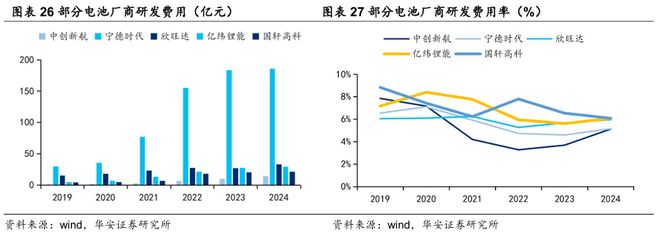 头部厂商高营收摊薄费用,支撑更高的研发投入。从行业整体研发投入格局来看,动力电池企业的研发强度普遍集中在3%-8%的区间,且各厂商投入比例保持相对平稳。然而在绝对金额层面,龙头企业与其他厂商已形成数量级差异。以2024年数据为例,虽然宁德时代5.14%的研发费用率低于亿纬锂能(6.05%)、国轩高科(6.07%)、兴旺达(5.94%),但宁德时代186.07亿元的研发资金规模却是亿纬锂能29.4亿元的6.3倍,国轩高科21.5亿的8.7倍,兴旺达33.3亿的5.6。这种规模化优势不仅稀释了头部企业研发成本占比,更形成“高投入-高技术壁垒-高市占率”的良性循环,进一步强化其行业统治力。