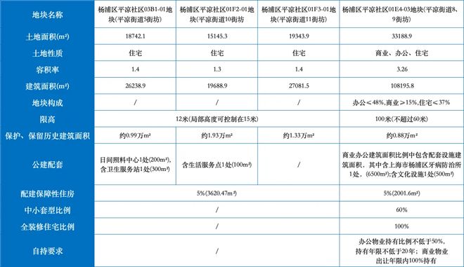 根据规划,杨浦外滩道平凉街道8、9街坊(平凉社区01E4-03地块)建设用地面积33188.9㎡,土地用途为商业、办公、三类住宅组团用地,混合用地建筑面积比例为办公≤48%,商业≥15%,三类住宅组团≤37%,容积率3.26。住宅建筑面积不超过40032㎡,住宅高度不超过60米,住宅总套数不少于385套。