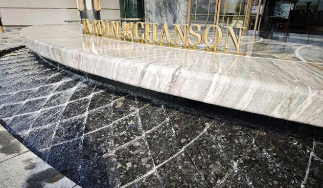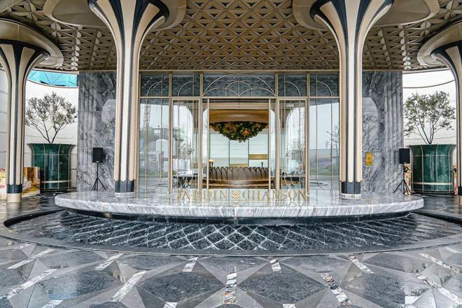 用「浮岛」元素的立柱撑在门口,顶部做了500多片的镂空透光铝板雕花花瓣。